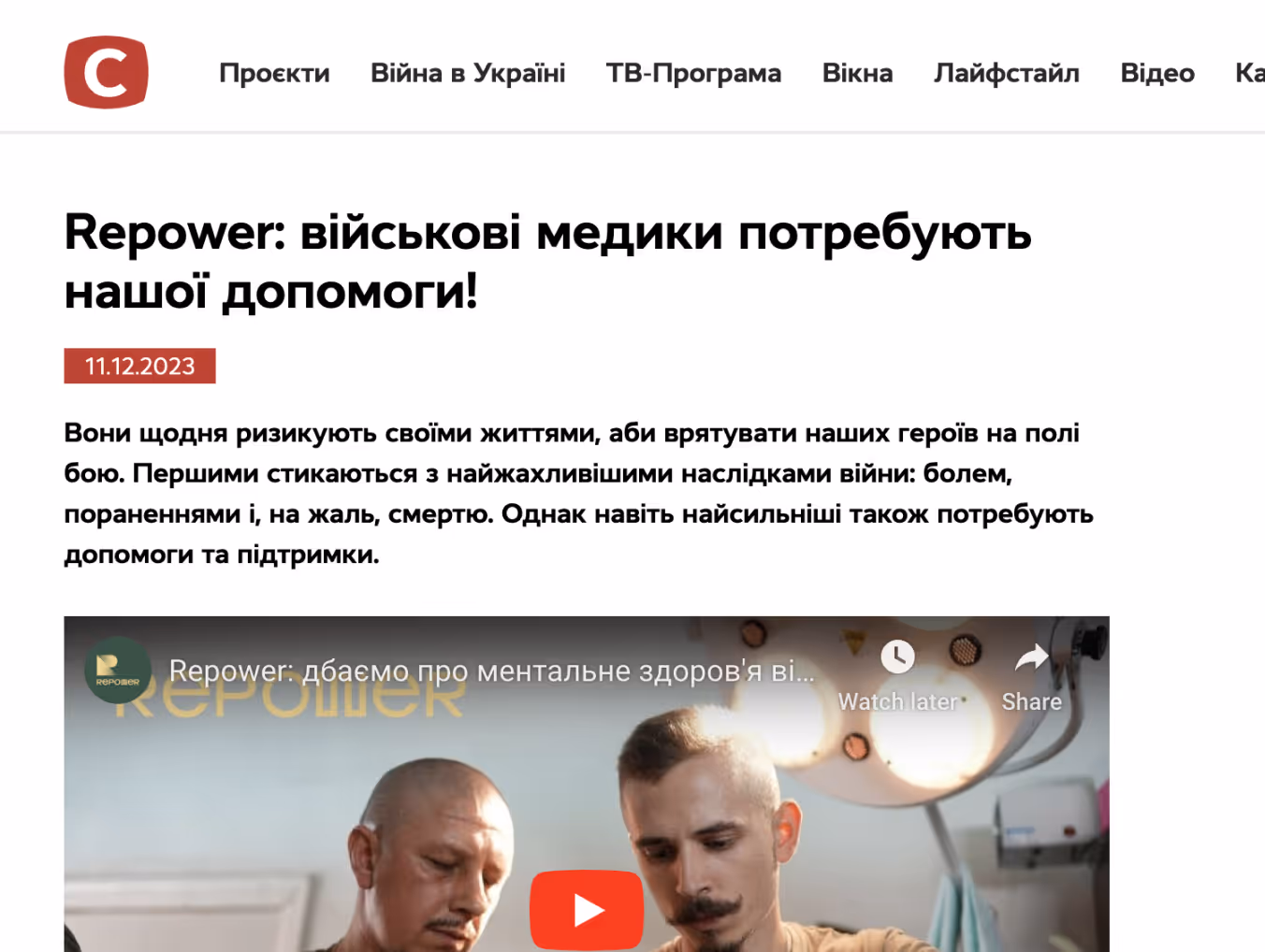 "Repower" NGO is an international organization dedicated to providing mental health support to prevent serious complex psychological illness including post traumatic stress disorders and concussions consequences among active frontline military medics, doctors, and volunteers, so they can continue saving others' lives on the battlefield.