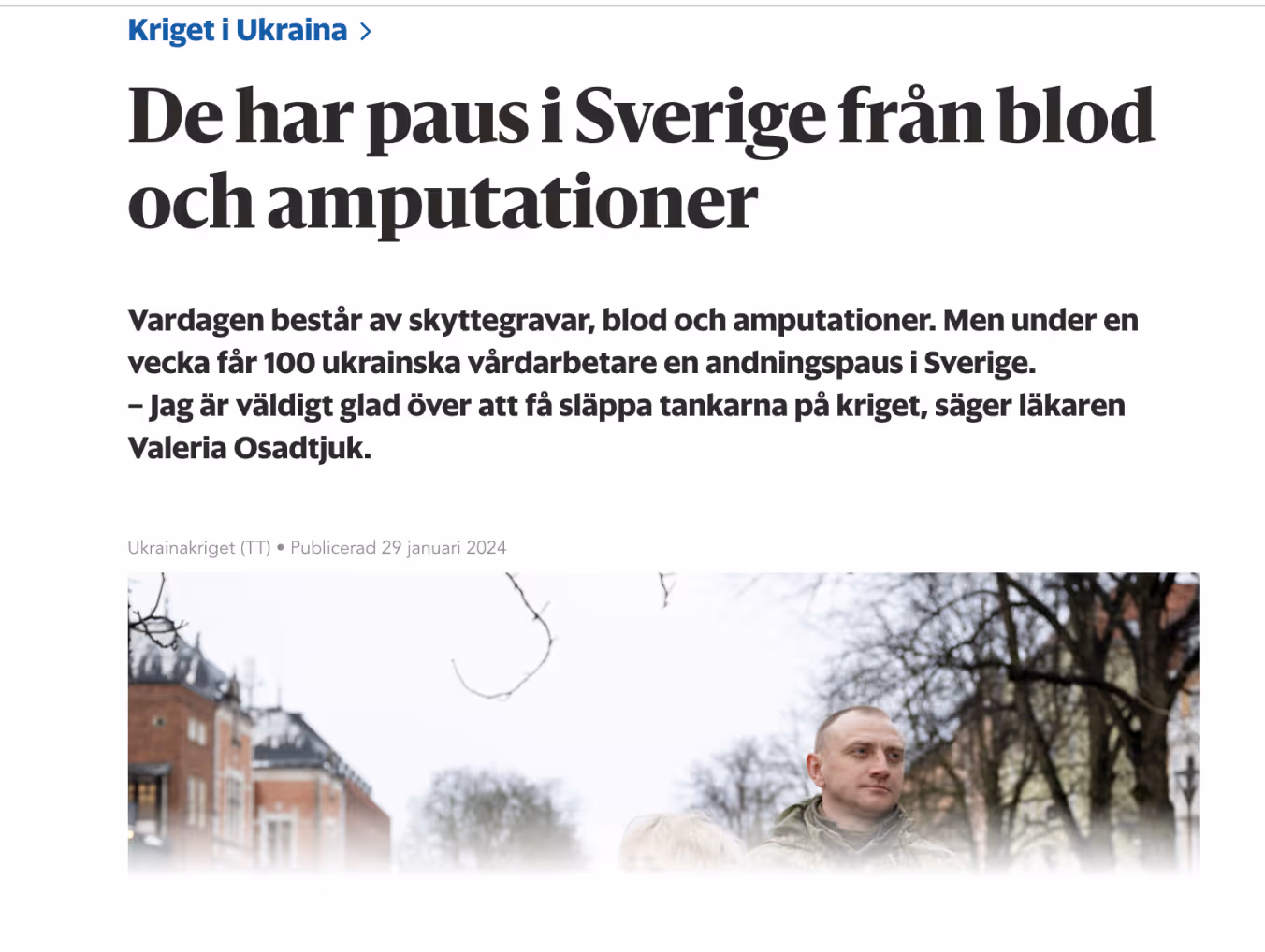 In order to exchange experience, acquire new knowledge and develop future partnership between Ukrainian and Swedish doctors and volunteers (for example: discussion of TSSS standards with combat medics of the Swedish Armed Forces, meeting at the hospital "Sophiahemmet", the rehabilitation center "Aleris", the organization "Framtidståger" ).
