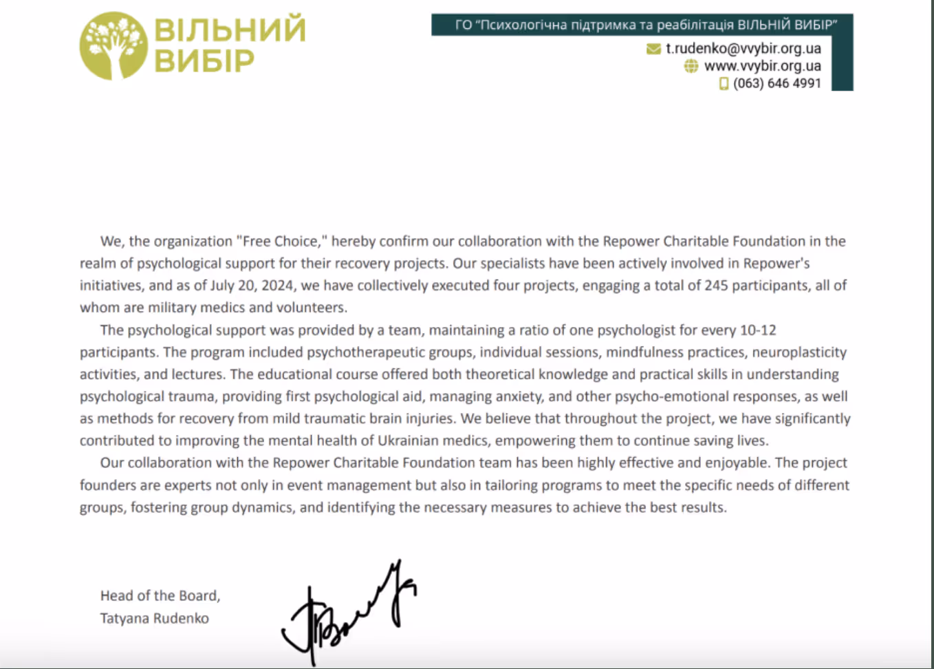 As of April 2025, we have already implemented 8 projects with the NGO "Free Choice" and continue our cooperation. We suggest reading the organization's feedback in the letter of recommendation below.